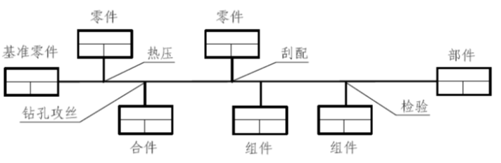在装配单元系统图上加注所需的工艺说明内容,如焊接、配钻、配刮、冷压、热压和检验等,就形成装配工艺系统图,如下。