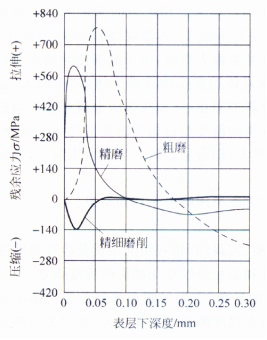 (1) 精细磨削条件下产生浅而小的残余压应力,因为表层金属的金相组织没有变化,主要是塑性变形的影响起主导作用。