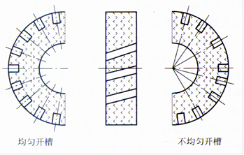 实际中多采用开槽砂轮,即在砂轮的圆周上开一些横槽,开槽砂轮的形状如上图所示,这就能使砂轮将冷却液带入磨削区;同时,开槽可使砂轮间断磨削,工件受热时间缩短,金相组织来不及转变,开槽砂轮还能起到风冷作用,改善散热条件。因此,开槽砂轮可有效地防止烧伤现象产生。开槽的形状主要有两种形式:均匀等距开槽和变距开槽。