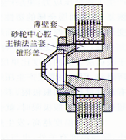 工作原理是将严格过滤后的冷却液通过中空主轴法兰套引入砂轮的中心腔内,在离心力的作用下冷却液会通过砂轮内部的孔隙向砂轮四周的边缘洒出,冷却液就有可能直接注入磨削区。然而,内冷却装置会产生大量水雾,影响加工条件,而且磨削冷却液必须严格过滤,要求杂质不超过0.02%,以防止堵塞砂轮内部孔隙。所以,其应用不广。