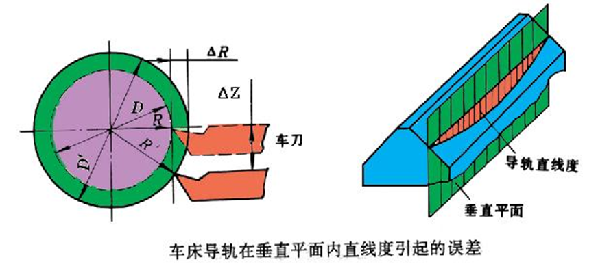 卧式车床在垂直面内存在直线度误差ΔZ ,见下图,则车刀尖的直线运动轨迹也要产生直线度误差ΔZ ,从而造成工件圆柱度误差,ΔR =Z2/2R,说明卧式车床对导轨在垂直面内的直线度误差不敏感。