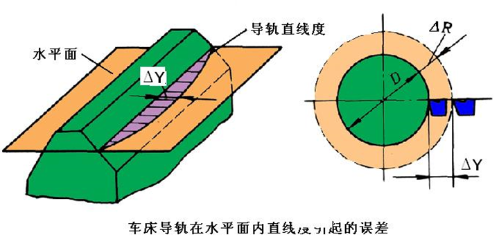 卧式车床在水平面内存在直线度误差ΔY ,见下图,则车刀尖的直线运动轨迹也要产生直线度误差ΔY ,从而造成工件圆柱度误差,ΔR =ΔY 。这表明水平方向是卧式车床加工误差对导轨误差的敏感方向。