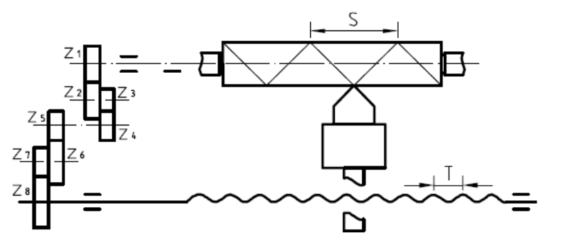 例如车削单头螺纹时,见下图,要求工件旋转一周,相应刀具移动一个螺距S,这种运动关系是由刀具与工件间的传动链来保证的,即保持传动比if 恒定,有