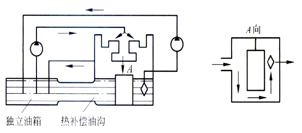 可采取回油补偿的方法均衡温度场,如下图所示。在床身下部配置热补偿油沟,使一部分带有余热的回油经热补偿油沟后送回油池。采取这些措施后,床身上下部温差降至1~2℃,从而热变形明显减少。
