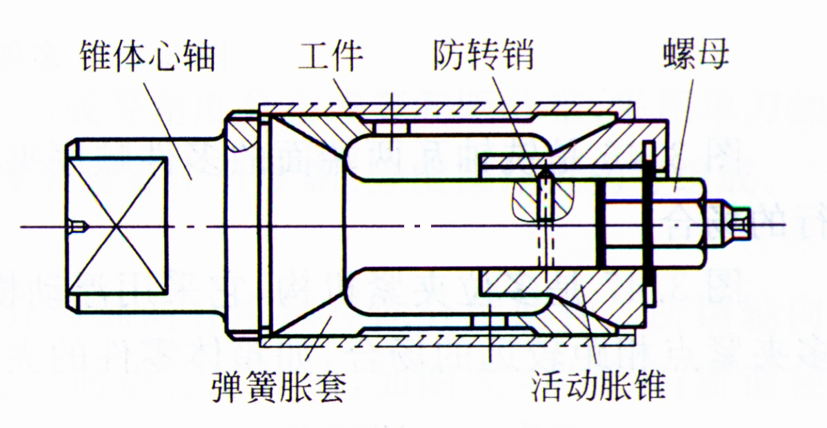 该机构的主要元件弹簧胀套为一个开有三四条或更多条槽的锥面套筒,弹簧胀套因其圆锥面受压迫而产生向外扩张的弹性变形,使工件圆孔定心并夹紧。