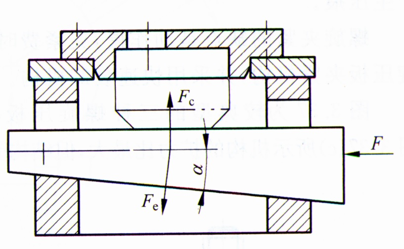 斜楔夹紧机构具有增力作用,当外加一个较小作用力时,可获得比作用力大好几倍的夹紧力。夹紧力和原始外力之比称为扩力比(或称增力系数)。斜楔夹紧机构的扩力比约为3。楔角愈小,增力越大;而升角的选取还与斜楔的夹紧行程有关。夹紧力的增加倍数和夹紧行程的缩小倍数正好相等,是斜楔夹紧机构的一个重要特性。