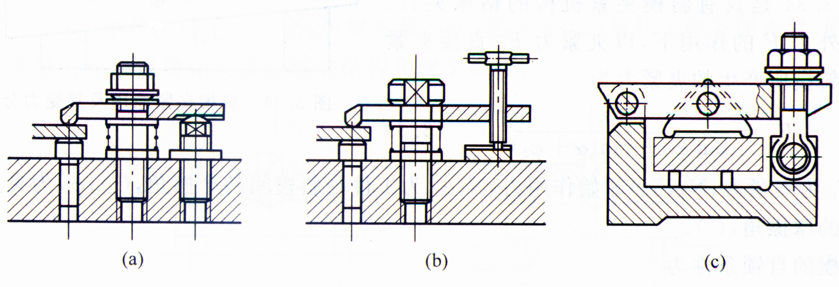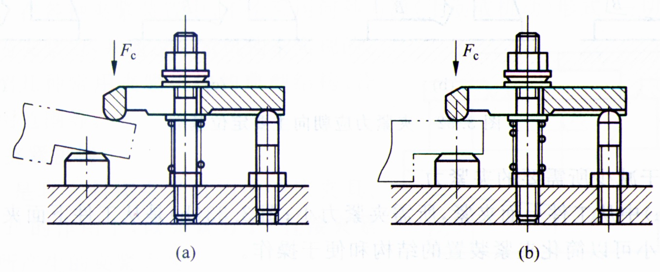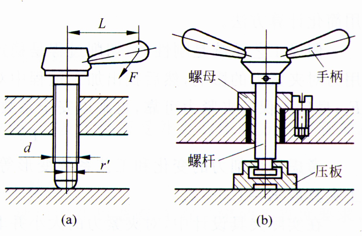 一种如图(a)所示,螺钉头部与工件表面直接接触,缺点是容易使工件产生移动。另一种如图(b)所示,螺杆的头部通过活动压块与工件接触,防止夹紧时带动工件转动,避免产生压痕。
