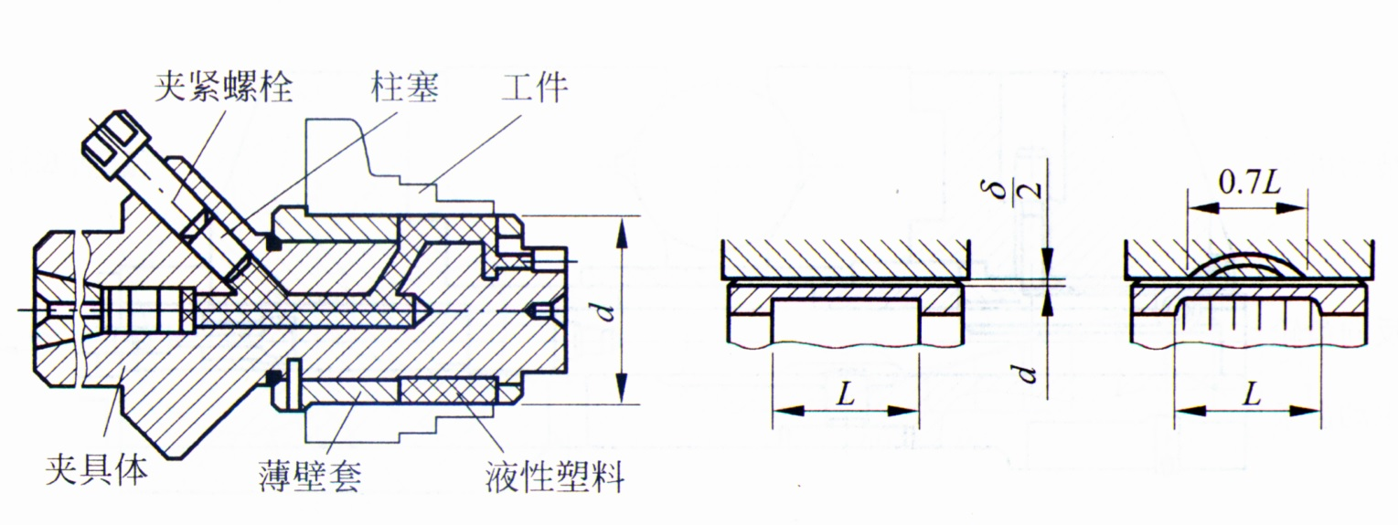 在液性塑料心轴上,工件以内孔为主要定位基准,套在薄壁套上,薄壁套的两端与夹具采取过盈配合,二者之间形成的环槽内注满液性塑料,作为传力介质。拧动螺钉,滑柱对介质产生压力,迫使薄壁套均匀变形,对工件定心夹紧。