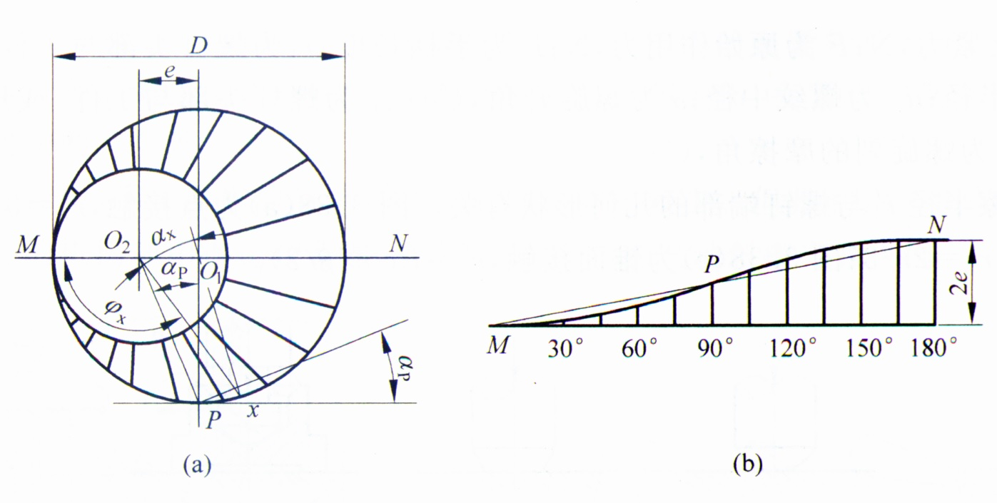 圆偏心的特性可用图4.41来说明,圆偏心直径为D,其旋转中心O2与外圆中心O1间的距离为偏心距e。当转动手柄后,由于转动轴心O2至圆偏心轮工作表面上各点的距离是不相等的,就相当于一个弧形楔卡紧在基圆和工件受压表面之间而产生夹紧作用。P点为偏心转轴中心与圆心连线处于水平位置时的夹紧接触点,如图4.41(a)所示。