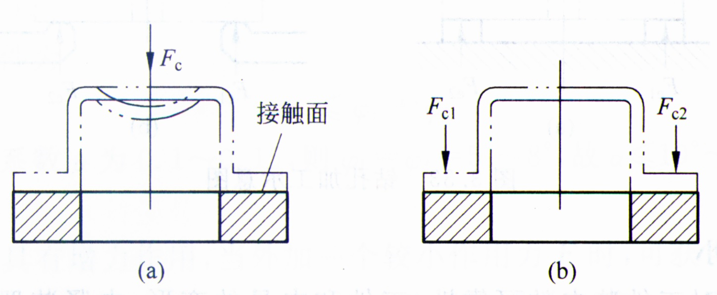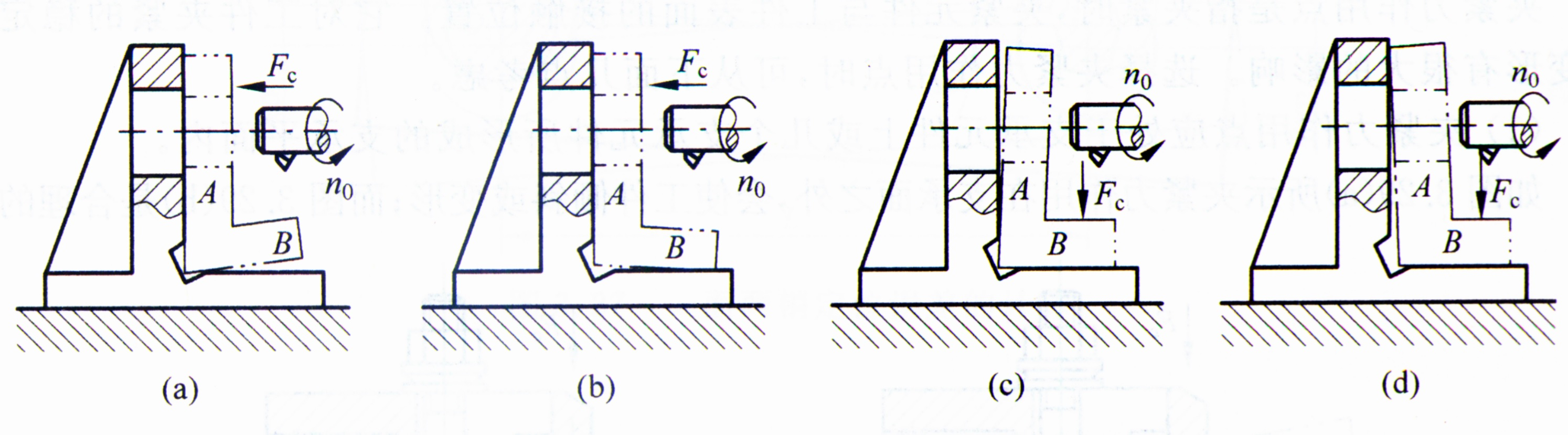 被加工孔与端面A有一定的垂直度要求,夹紧力Fc垂直作用于主要定位基准A,图(a)和图(b)保证定位要求,又使工件定位稳定可靠。如果被加工孔与端面B有一定的平行度要求,则夹紧力Fc垂直作用于主要定位基准B,见图(c)和图(d)所示。