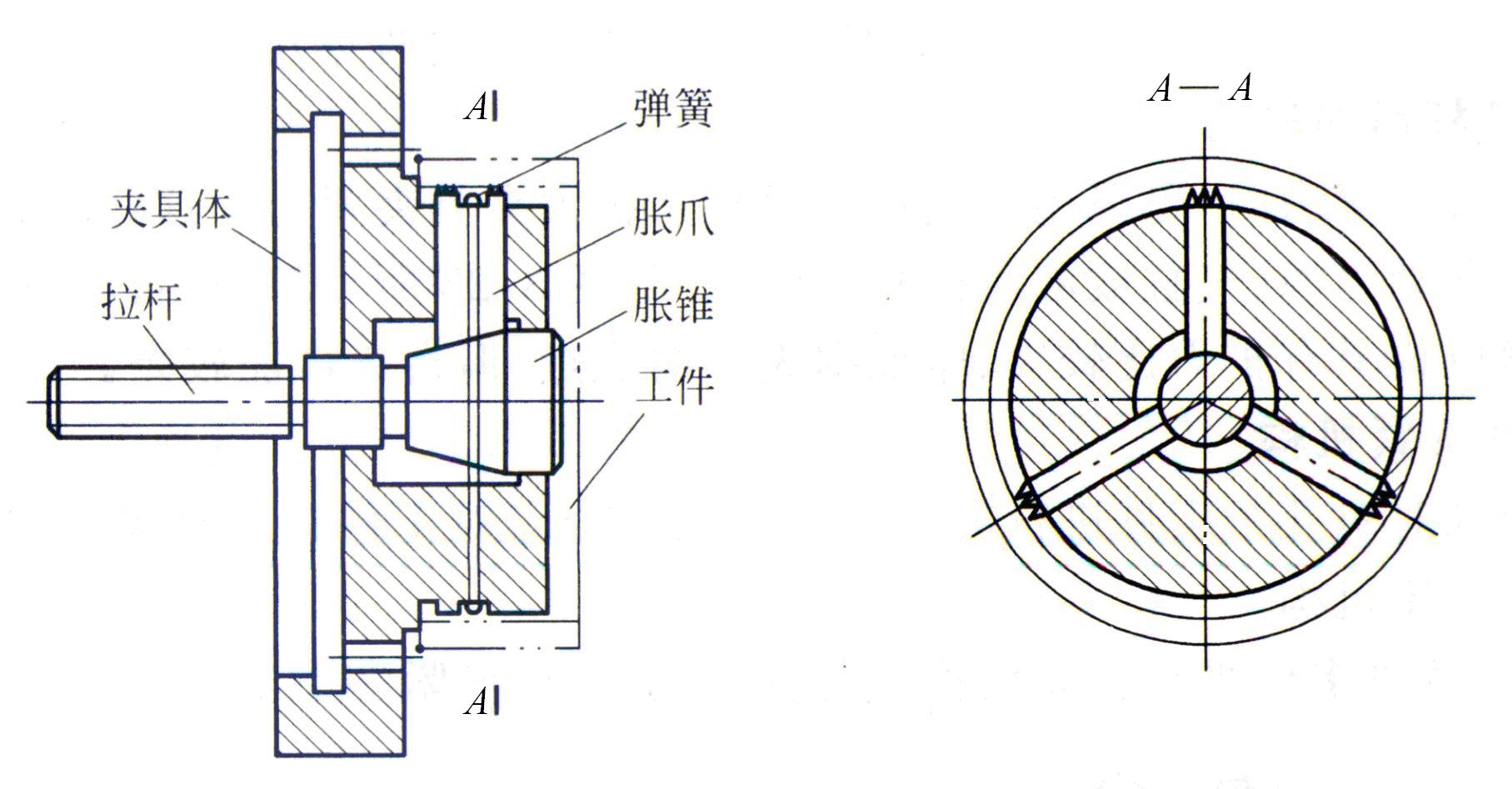 这类机构的共同特点是利用弹性元件受力后的弹性变形来实现定心夹紧作用。其定心精度比上一类高,适合于精加工过程,常见的有下面几种类型。