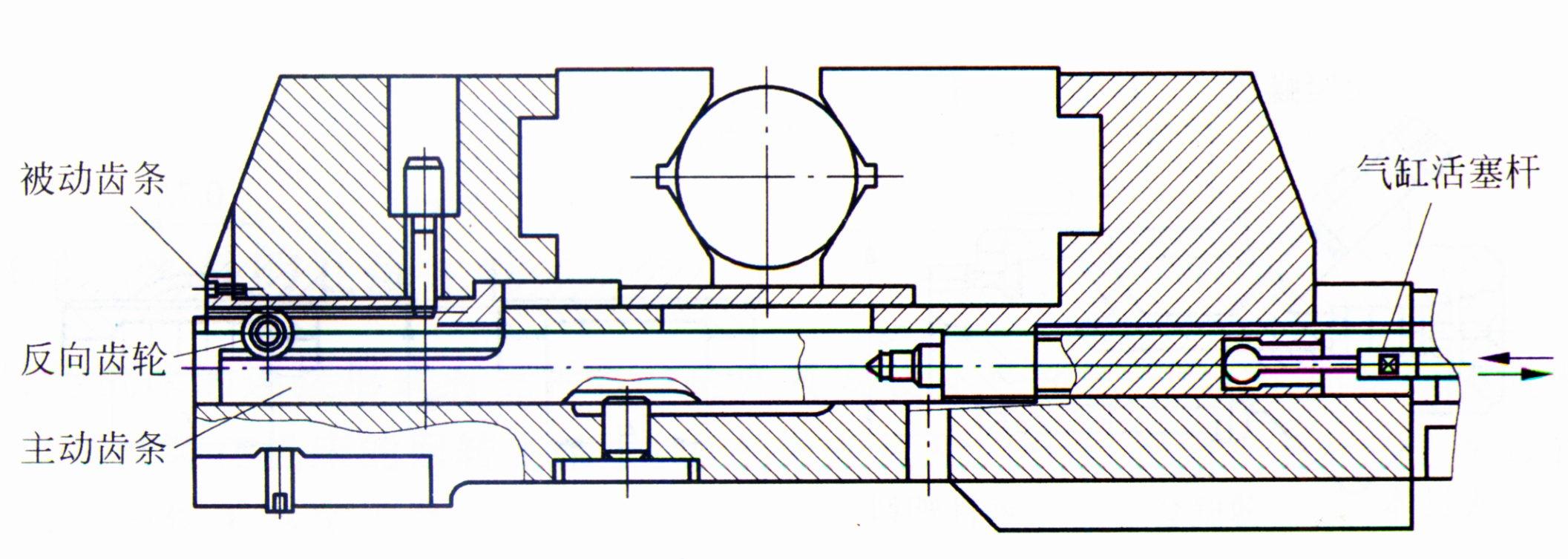 齿条传动的虎钳式定心夹紧机构常在打中心孔机床上使用。主动齿条和被动齿条,分别与V型块和气缸活塞杆联接,利用反向齿轮将两个齿条运动进行等速反向,当活塞杆向左移动时,两V型块获得对向运动,从而定心并夹紧工件。松开时,其运动则相反。