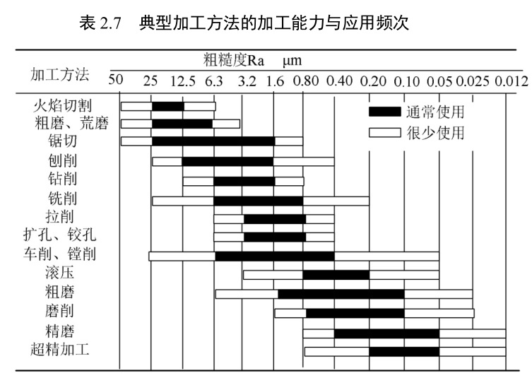 由典型加工方法的加工能力与应用频次的关系(参见表2.7)可以看出:每种加工方法能达到的表面加工质量还是非常宽的。