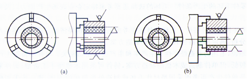下图套筒镗孔加工,如果外圆柱面是不加工面,应该用图(a)以外圆柱面定位,保证壁厚均匀。