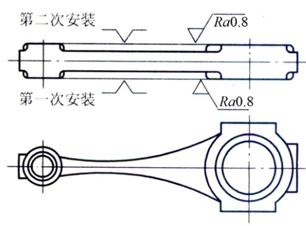 连杆磨削工序,包含两个安装,两个安装的定位基准关系是互为基准。