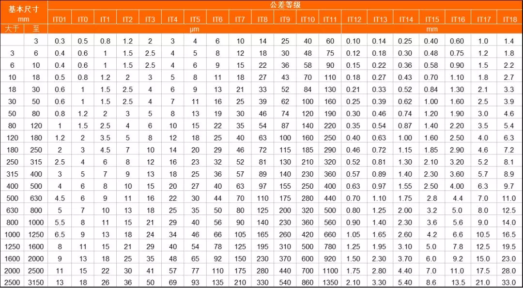 注:基本尺寸小于1mm时,无IT14至IT18