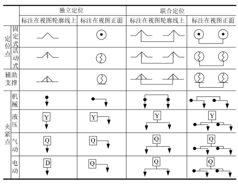定位基准选定后,依据定位基准的几何特征、零件的结构以及加工表面情况,进一步可以确定工件的夹紧方式和夹紧位置。用下表中的定位与夹紧符号在工序简图上标记定位基准和夹紧位置。