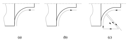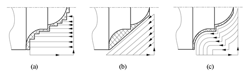 “工件轮廓线形”进给路线如图(c)所示。在同等条件下,上述三种进给路线中“矩形”进给路线切削所需时间(不含空行程)最短,刀具的损耗最小。
