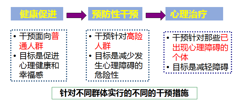 心理干预(psychological intervention):是指在心理学理论指导下有计划、按步骤地对一定对象的心理活动、个性特征或行为问题施加影响,使之发生朝向预期目标变化的过程。
