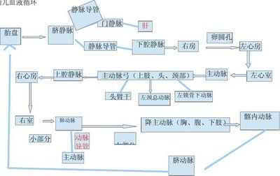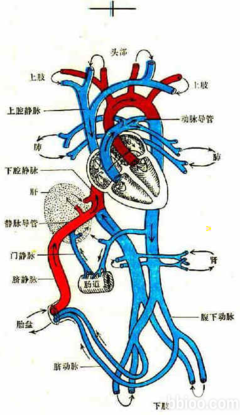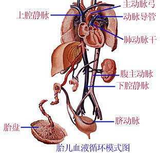 胎儿时期的营养代谢与气体交换是通过脐血管和胎盘与母体之间以弥散的方式进行,含氧量较高的动脉血经脐静脉进入胎儿体内,在肝脏下缘分流为两支:一支入肝脏与门静脉汇合后经肝静脉进入下腔静脉;另一支经静脉导管直接进入下腔静脉,与来自下半身的静脉血混合,流入右心房。来自下腔静脉的血液(以动脉血为主)进入右心房后,1/3血量经卵圆孔流入左心房,再经左心室流入升主动脉,主要供应心脏、头部和上肢(上半身);2/3血量流入右心室。从上腔静脉回流的、来自上半身的静脉血,进入右心房后,绝大部分流入右心室,再转入肺动脉。由于胎儿肺脏无呼吸功能,肺血管阻力高,故肺动脉的血只有少量流入肺,大部分进入右心室的血液经动脉导管流入降主动脉,与来自升主动脉的血汇合,供应腹腔器官和下肢(下半身),最后血液经脐动脉回到胎盘,再次进行营养和气体交换(图10-1)。