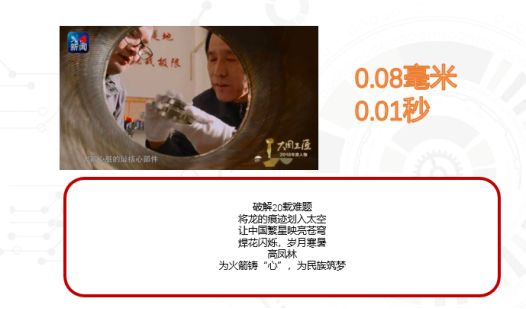 高枫林得故事,发动机是火箭的“心脏,他,是焊接火箭“心脏”的“中国第一人”。他曾参与40%的长征系列火箭的“心脏”焊接。0.08毫米,这是火箭燃料输送管道壁的厚度,焊枪停留在上面的时间不能超过0.01秒,否则就会焊穿管壁。任何一个漏点,在火箭升空过程中都可能会引发毁灭性爆炸。但高凤林就是能做到,在0.01秒内精准控制,上万次的操作都准确无误。希望同学们在学习的过程中也可以学习高枫林老师的一丝不苟。