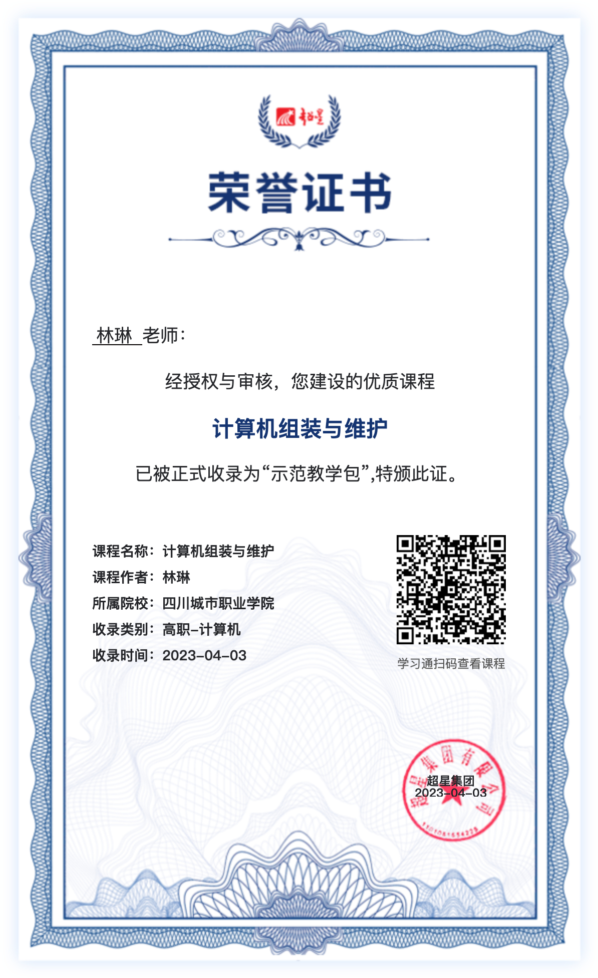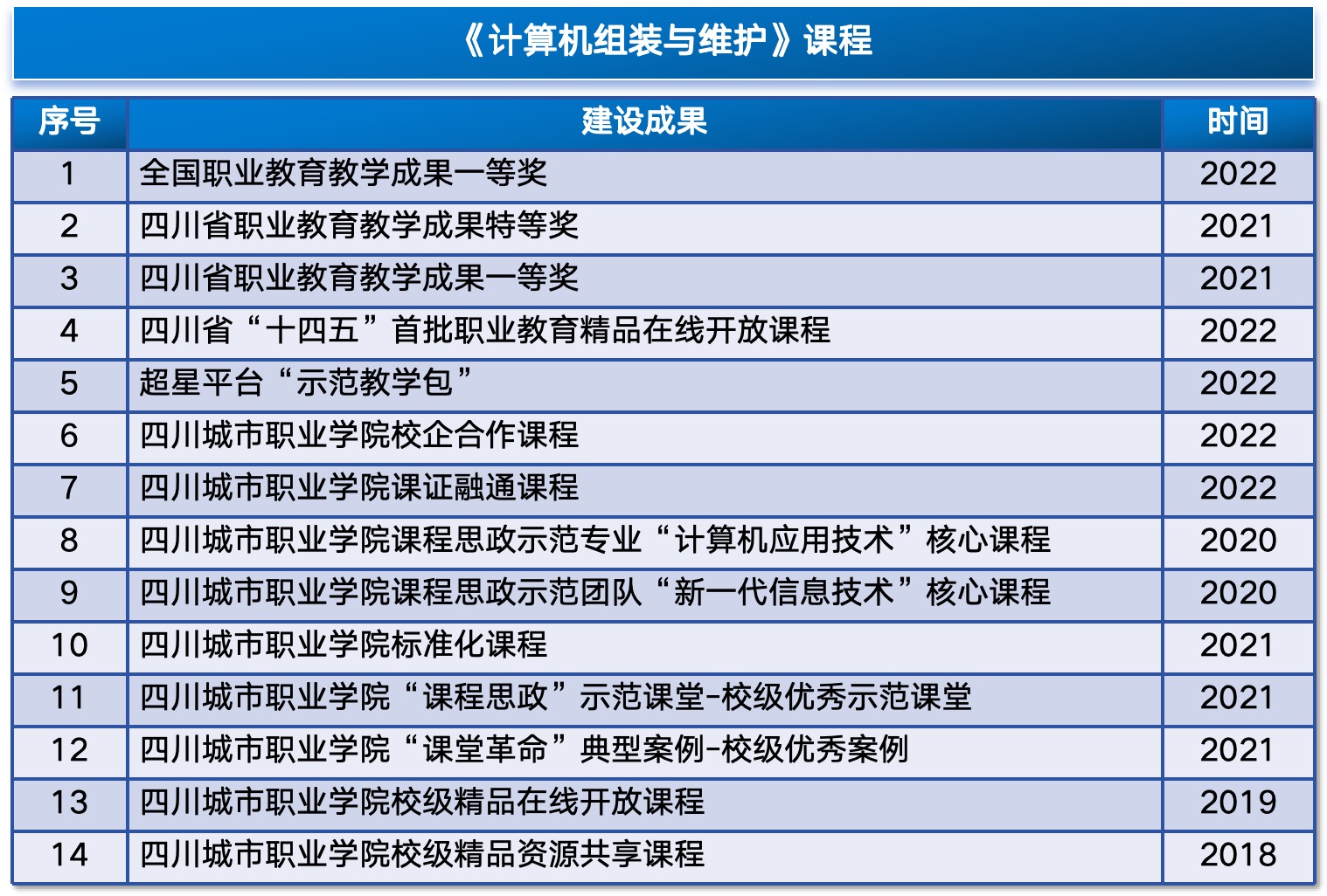 《计算机组装与维护》课程上线学银在线课程平台,全网开放授课,2022年认定四川省“十四五”首批职业教育精品在线开放课程,2021年全国技工院校教师教学能力大赛全国三等奖作品《笔记本电脑BIOS典型维护》所在课程,立项校“课程思政”示范课程,课程团队立项校课程思政示范教学团队,课程所在计算机应用技术专业立项校课程思政示范专业。获评超星示范教学包。