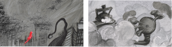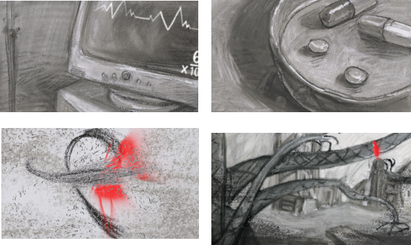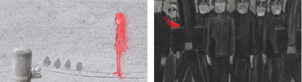在这里先拿我创作的实验动画《红色幽灵》(2009)来说明主题与材料的关系吧。由于此件作品是针对中欧短片竞赛创作的,内容就要符合大赛的主题。大赛的内涵是提倡可持续发展,主题是“理想与现实的城市”。在创作该动画作品前,我经过一段时间的思考和查阅相关资料,想让这部影片呈现独特的视角来叙述如何面对理想和现实的城市,然后想为观众展示一种他们未曾见到过的风格。于是我的创作思路开始了,先确立其主题:关注可持续发展,在作品中倾注生态伦理观,描绘人——社会——自然三者面对当今日益恶化的生态环境,而且这个生态伦理观通过一位病危的小女孩的视角来呈现。为很好地表达受环境恶劣影响的主题,同时想为观众呈现他们意想不到的视觉效果,我在众多的材料中选择了有颗粒质感,略有粗糙风格的色粉材料。此材料不但有着油画的厚重和水彩的灵动之感,而且适合表达有沙尘的风景,从而让艺术作品更好地体现深切的社会意识和高度的人文关怀。具体创作思想和过程表现在以下几个方面: