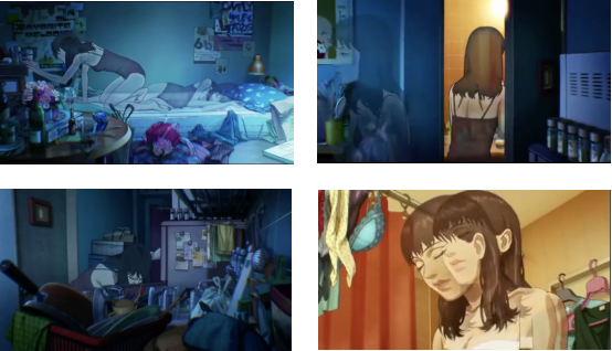 例如今敏的实验动画《早上好》将人物现实与虚幻的动作符号做了精心的设计,非常独到地描写了人物的情绪。今敏将清晨人们迷迷糊糊的状态用同时出现在现实和虚幻中的动作符号巧妙地表现出来。任谁都有这样的体验:早上迷迷糊糊苏醒,洗漱,整理好着装,甚至是到了工作地点或者学校,却突然醒来,发现自己在床上;又或者是起床之后在无意识的情况下洗漱整装,等真正醒来时已经准备就绪了。今敏将这种状态用“两个自己”的动作来表现,分辨不出孰真孰假,谁虚谁实,伴着黎明的浅蓝色光芒,一切都好似梦境一般,直到她们合二为一,一句早上好,才将观众们带到现实,让观众也有一种刚刚洗了一下脸的感觉,一切都豁然开朗,在这里,整个动画的色彩也变得明亮温暖,新的一天再一次开始。
