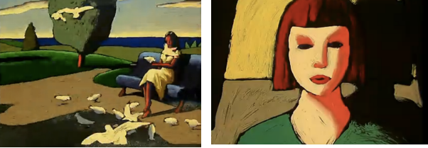 我们再来看瑞士著名的实验动画导演乔治·史威兹贝尔(Georges Schwizgebel)的作品,他的动画作品大多具有印象派和野兽派的视觉效果以及音乐性。现在谈谈《青年姑娘和天上的云》(The Young Girl and the Clouds,2000)这件作品。这件作品同样具有印象派和野兽派的风格,作者使用丙烯颜料逐帧绘画在赛璐珞胶片上,有着油画的笔触效果,色彩艳丽,而整部影片没有一句对白,给人以超强的镜头感和空间感。这样的美术风格,作者是怎样将设计动作的呢?首先作者为这部影片设计了节奏感强的背景音乐,画面中所有物像的动作都随着音乐的律动富有感情地运动起来。比如云的动作,不是我们常规看到的慢慢的飘动,是舞蹈一样的聚集和散去;飞鸟不是通常的快速扇动翅膀或滑翔,而是随音乐一起舞蹈。