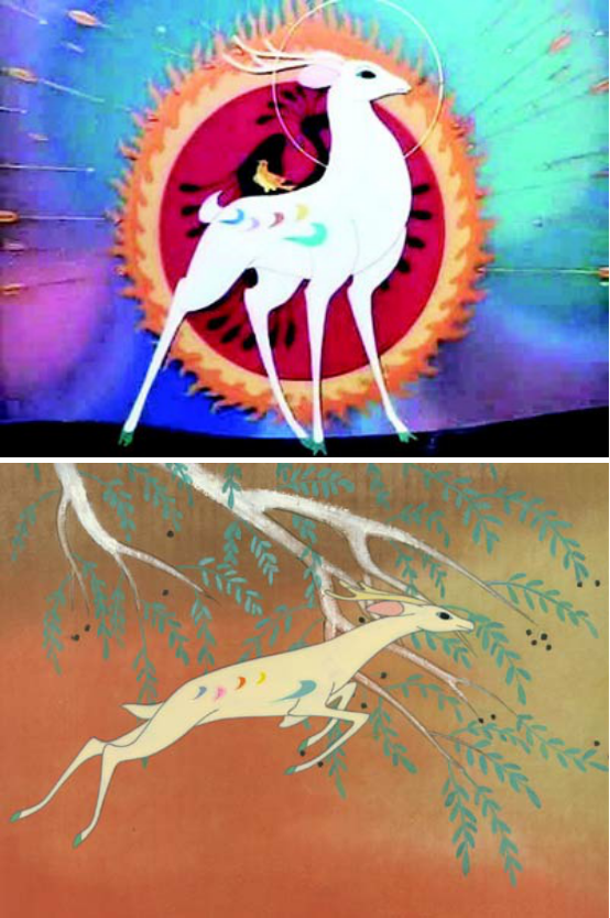 再如由上海美术电影制片厂制作钱家骏导演的《九色鹿》(1981),根据敦煌莫高窟257洞内壁画《鹿王本经》故事改编的,在美术设计上采用具有中国古代佛教绘画风格的敦煌壁画形式,结合佛教舍生取义、普济众生的内容,绘制了完美的动画角色和场景,呈现了敦煌壁画生动恢宏艳丽色彩蕴含的艺术家主观精神。
