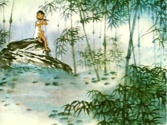 中国的表现主义动画作品多为“写意”,这与西方表现主义由内而外的自我精神表现、反对艺术对自然的摹仿本质是一致的。这些中国表现主义动画作品的写意性在主观激情表达上不像西方表现主义绘画色彩鲜明,更为寻求主客观的统一,是一种意象的表达,追求形式和内容的和谐统一。在艺术形式上追求虚实相生,以虚带实的意境和韵味,内容作为形式的有机载体,艺术想象贯穿在题材内容上。如由上海美术电影制片厂制作特伟、钱家骏导演的《牧笛》(1963),根据著名国画家李可染的绘画风格绘制,结合婉转悠扬的笛声,将中国的“写意”表达得淋漓尽致。创作者借用中国画的艺术形式,不是对客观现实的描摹,而是强调自己内在精神的表达,让观众欣赏到一部意境深远的动画作品。