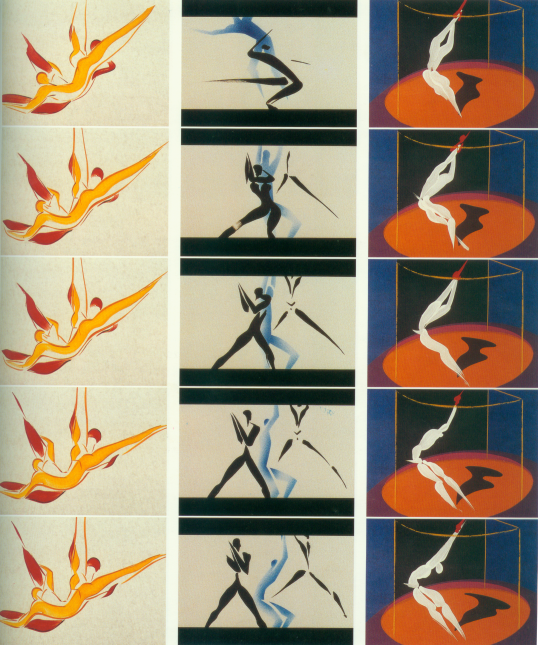 实验动画艺术家埃里卡·拉塞尔(Erica Russell)的抽象动画作品《三人组舞》(Triangle, 1994)表现了一个男人和两个女人的之间爱情纠葛。拉塞尔大量运用音乐及其他艺术形式,从古典精神到现代派意识流,将图形符号、音乐和舞蹈融合在一起。在作品中用一系列舞蹈动作表现了作者想表达的情感,例如爱、嬉戏、侵犯和虐待。拉塞尔在创作上反对使用情节串联故事版和叙事手法,她用这样简洁、提炼的抽象图形和色彩,及随心所欲的状态讲述了三人间爱恨交织的故事。