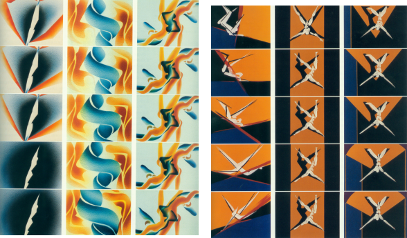 另一件抽象动画作品《疾驶的火车》(The speeding train,1974)来自实验动画艺术家和教育家朱尔斯·安格尔(Jules Angell),这件作品是安格尔运用了多次重叠丝网印刷术,以黑白变化的块状构成抽象的形态,借此塑造一种快速移动穿越风景的特效。安格尔在影片中追求内容和形式的统一,形状和色彩的统一,他更青睐于使用“运动的艺术”这一定义来说明他的工作。他诠释到:“运动乃行为活动。我们对其的反映将受到人的主观思维的状态和运动自身属性的影响。我的工作是抽象的,但是它蕴藏着启发人们内心情感的有机元素。”简安·迪尔在评论传记是这样描述安格尔的:“高明的艺术家和电影制作人,在实验动画和各种艺术领域(绘画、版画、雕刻)中,他的抽象绘画和电影沿着一条幻想之路潜行了60余年之久。”