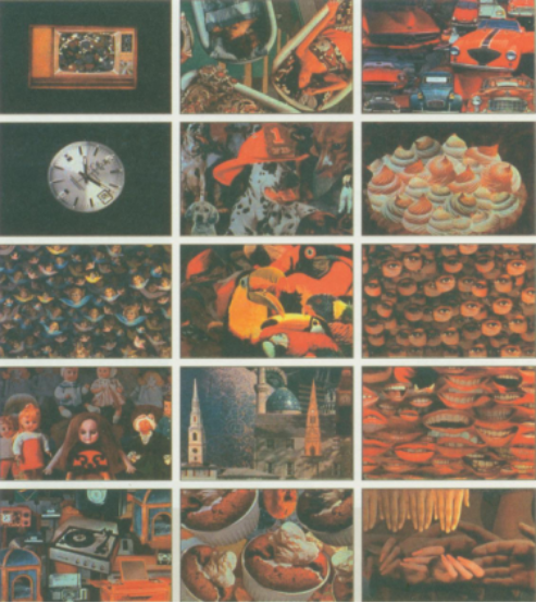 美国的实验动画艺术家弗兰克·莫里斯(Frank Film,1973)创作的《弗兰克电影》描绘了作者所处的20世纪60年代美国消费社会。作者通过若干杂志收集整理了50万张剪样,再将这些剪样以几何方式重新排列组合,在赛璐璐胶片上组成一帧一帧图像,用相机以单画双格的方式拍摄出来。如此多的图片在弗兰克的设计下,一点不凌乱,反而有序,画面节奏刺激着观众的感知能力,又在其中达到平衡。影片中帧与帧之间的图像部分重叠,创造出一种不断变换的时间关系,结构平稳,具有波普艺术特征,成为反传统的开拓性的拼贴动画作品。