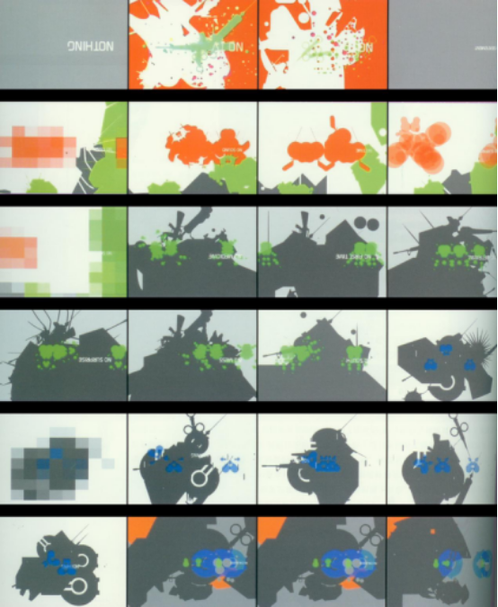 法国的“Pleix”小组创作的实验动画《Bleip:No》用几种纯色的色块构成结合音乐的律动混合为暴力和美丽的影像,表达了一种压抑的情绪和轻度暴力的倾向,这是高克勒(“Pleix”小组成员之一)朋克式颓废艺术的真实写照。