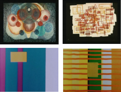 德国抽象实验动画先驱奥斯卡·费钦格( Oskar Fischinger)被纽约时代周刊称为“电影界的康定斯基”,他早在1920年就开始着手手绘的电影技术,并于1922年开始运用图像和流行音乐的同步技术制作富有情感的抽象实验动画作品。《动感无线电》(Radio Dynamics,1942)和《运动绘画1》( Motion Painting No. 1,1947)都是他的代表作品。作品中图形的形状、颜色、动作都巧妙设计在传达作者情绪中。《动感无线电》费钦格在和合作人合作失败后,将此片变成了无声电影,最后成为令人震惊的有关内心独白和冥思的抽象语言作品。作品中不平均的图形符号和颜色的分割,在同一位置不同时间的圆形、方形的变化,表达了作者想对观众说的话和他的情绪。