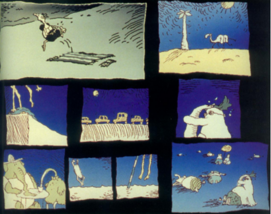 加拿大的另类实验动画大师保罗·德里森(Paul Driessen)是优秀的插画师,他的实验动画作品《四季里的世界之末》(The End of the World in Four Seasons,1995)探讨实验动画叙事的形式,作品的特别之处在于通过8个不同的屏幕,每个季节通过典型的情节表现出来作者的观念。比如:秋季,蛇追赶青蛙;夏季,蚊子折磨旅行者等。所有这些屏幕安放在几个不同的平板中,每块平板首尾相连,直至世界毁灭。德里森简约的造型风格在几块分割的屏幕上,让观众结合自身的经验去思考。在这些不同的被分割的屏幕中,观众每次不只是看到一个故事,有的放到一半,有的刚刚开始,有的已经结束,而这些所有的画面有着相互联系的图像和主题,表达着德里森故事与诸多信息之间谨慎的平衡,和研究指导观众如何观看复杂故事的观念。