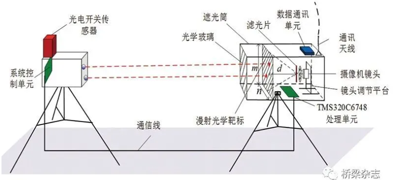 长安大学结构智能检测研究所研发了激光基准桥梁结构挠度多维度智能实时监测系统。该系统基于双激光基准实现桥梁的多维挠度参数检测,利用光电检测技术将桥梁结构的多维挠变信息转换为激光光斑中心在靶标平面上的坐标变换,通过数字图像处理技术求取出激光光斑中心的坐标信息,从而间接解算出桥梁结构的挠变信息。