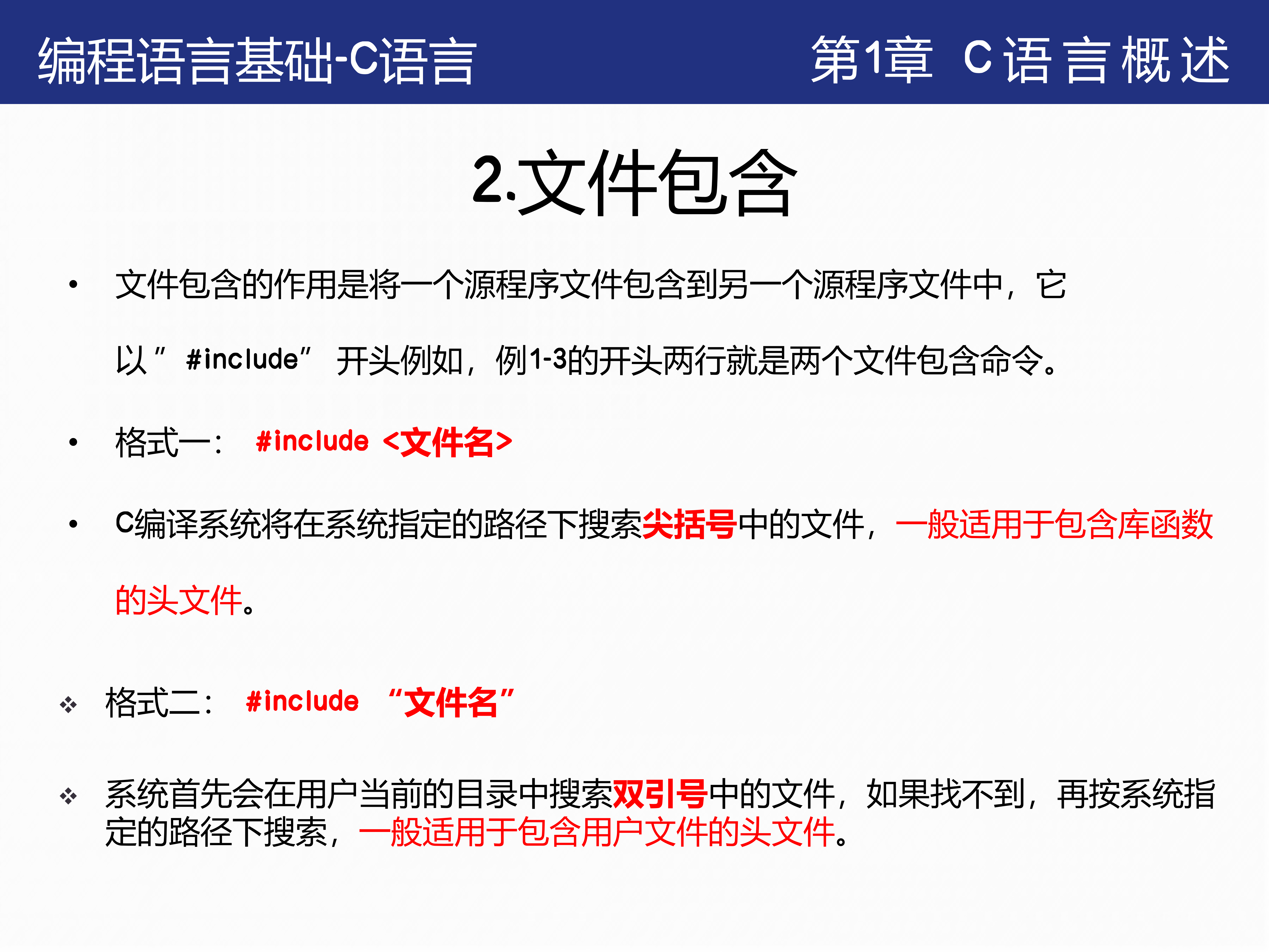 2. 掌握文件包含的作用与格式:熟悉#include的两种格式及其使用场景。