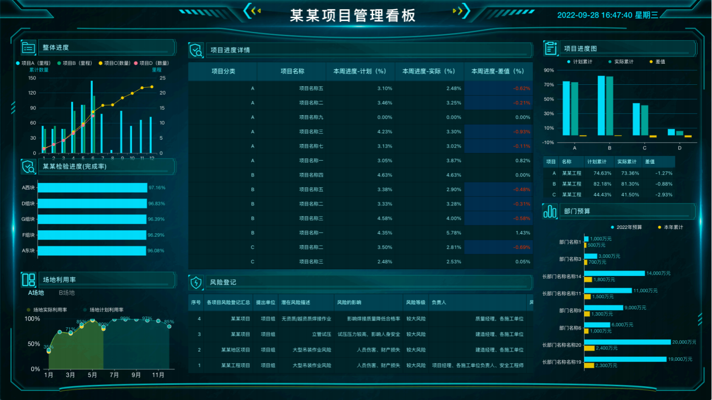 仪表板主要元素添加完毕后,我们对每一个组件,进行调整,最后形成一个整洁大方的仪表板,主要步骤如下: