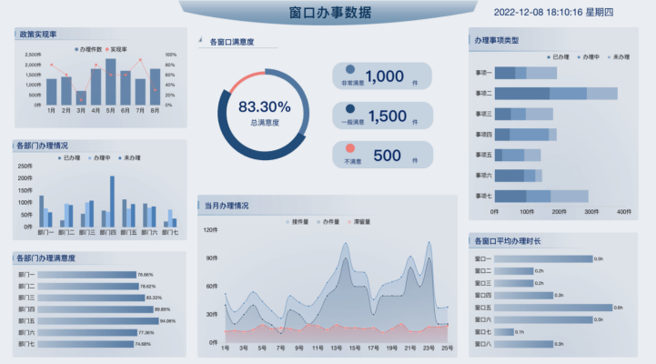 本项目将制作一个政务窗口办事数据分析仪表板,效果图如下: