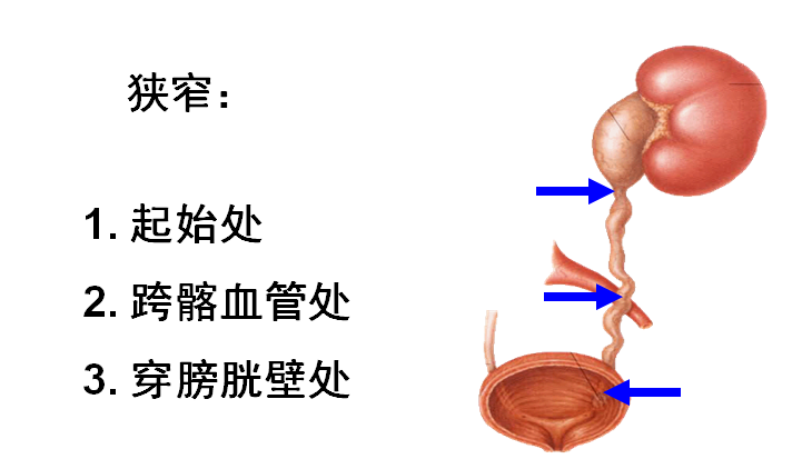 2.输尿管按行程分腹段、盆段和壁内段,有3处狭窄,在女性子宫颈侧方与子宫动脉相交叉,子宫切除术结扎血管时应特别注意。