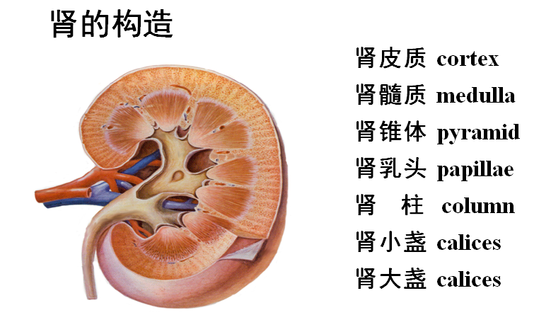 1.肾是蚕豆形的实质性器官,其内侧缘凹陷称肾门,有肾动脉、肾静脉和肾盂等出入,这些结构被结缔组织包绕形成肾蒂。自肾门向肾实质内凹陷而形成的腔隙称肾窦,内有肾大盏、肾小盏和肾盂等。