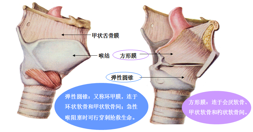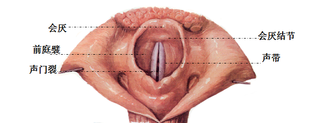 会厌、杓状会厌襞和杓间切迹围成喉口,喉口以下即喉腔;喉腔以前庭襞、声襞为界分为喉前庭、喉中间腔和声门下腔,其中声门下腔的黏膜较疏松,易水肿造成喉阻塞。