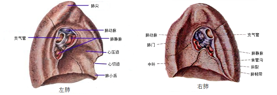 肺呈圆锥形,内侧面有支气管、肺动脉、肺静脉等出入称肺门,这些结构被胸膜包绕形成肺根,其内的结构自前向后依次为肺静脉、肺动脉和主支气管,自上而下左肺是肺动脉、主支气管和肺静脉,右肺是上叶支气管、肺动脉、中下叶支气管和肺静脉。