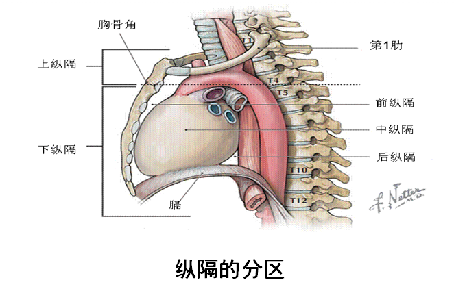纵隔是两侧纵隔胸膜间的全部器官、结构的总称,以胸骨角平面分为上、下纵隔,下纵隔又以心包前、后壁分为前纵隔、中纵隔和后纵隔。