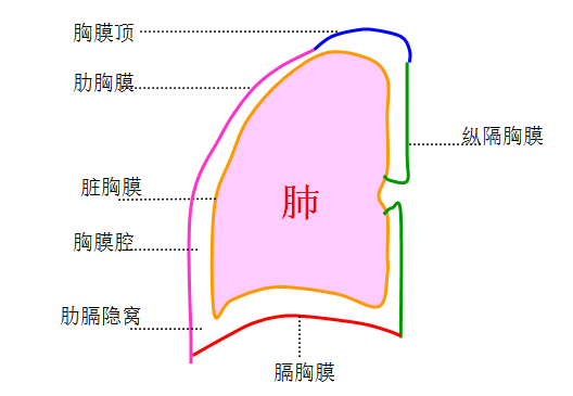 胸膜在胚胎时期,肺芽向两侧胸膜囊内突入,肺芽发育为肺,几乎占据胸腔。覆盖于肺的胸膜称脏胸膜;衬覆于胸壁内面、膈上面和纵隔侧面的胸膜称壁胸膜,脏、壁胸膜之间潜在的腔隙称胸膜腔。