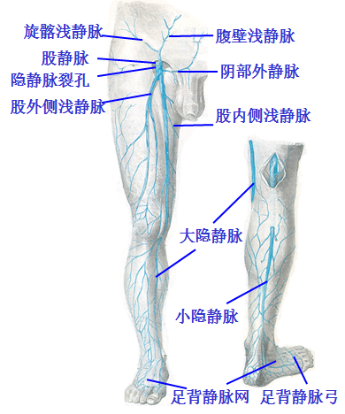 大隐静脉是全身最长的浅静脉,起自足背静脉弓内侧缘,经内踝前方上行注入股静脉,其末端收纳股内侧浅静脉、股外侧浅静脉、腹壁浅静脉、旋髂浅静脉和阴部外静脉,是下肢静脉曲张的好发部位。