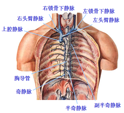 奇静脉起自右腰升静脉,收集胸壁的静脉血,有半奇静脉和副半奇静脉注入;奇静脉跨过右肺根上方,汇入即将注入右心房的上腔静脉。
