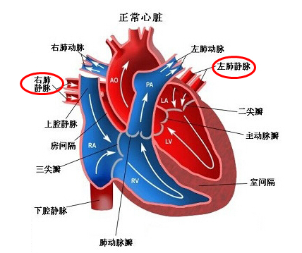 肺循环静脉每侧2条,即左肺上、下静脉和右肺上、下静脉,自肺门向内侧穿纤维心包注入左心房,将含氧量高的血液输送到左心房。